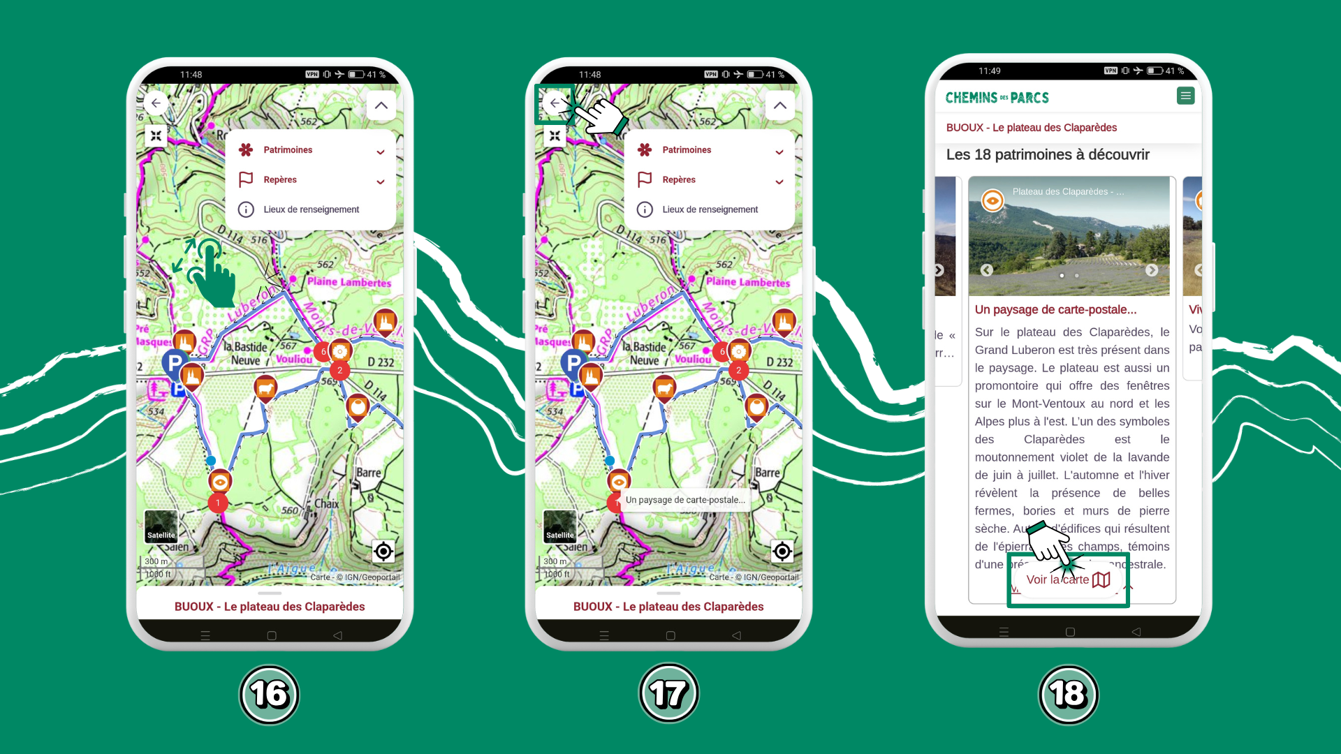 15. J’affiche sur la carte les numéros repères du pas à pas et les éléments de patrimoine.
