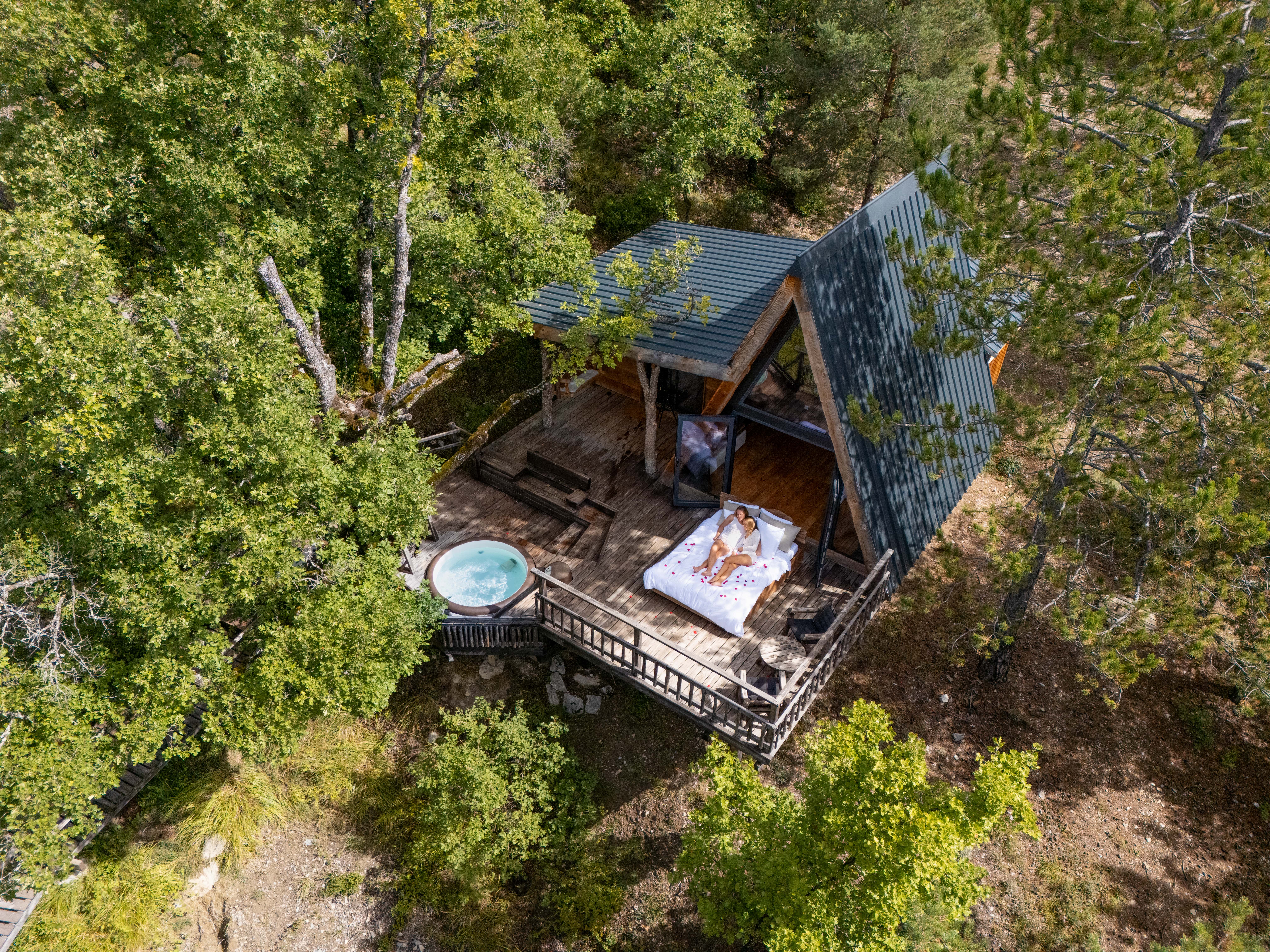 Dans un domaine de 3ha, 4 cabanes perchées de grand standing (toilettes et douches dans la cabane), avec spa sur la terrasse perchée : grande pièce avec 1 grand lit et salle d'eau (toilettes et douche) et petit coin repas.