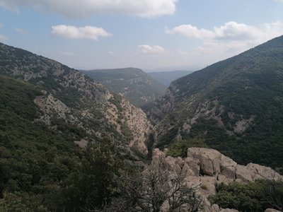Depuis ce promontoire, on distingue les barres rocheuses qui émergent des vallons, la source de la Pare en contrebas, ainsi qu’une forêt dense de chênes verts. Par temps clair, le regard porte jusqu’au Mont Vinaigre, identifiable à ses deux antennes.